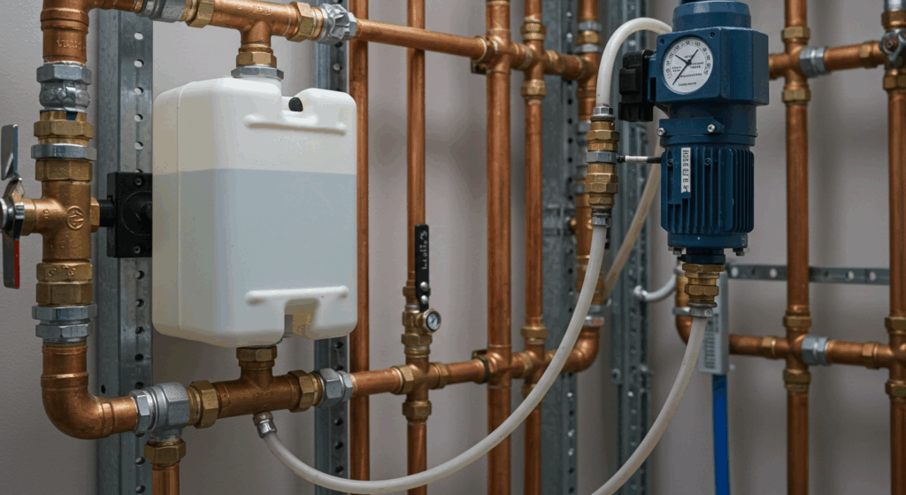 A guide to recommissioning a commercial water system by Pipe Testing Services, over a background photo of a professional chemical dosing system in a plant room.